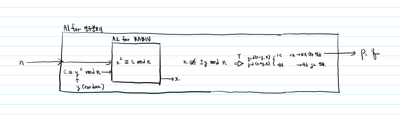이 c를 A2에 입력으로 넣으면, 애초에 A2은 무조건 Rabin 암호를 풀 수 있다고 전제했던 녀석이므로, x를 출력할 수 있다 (able).
