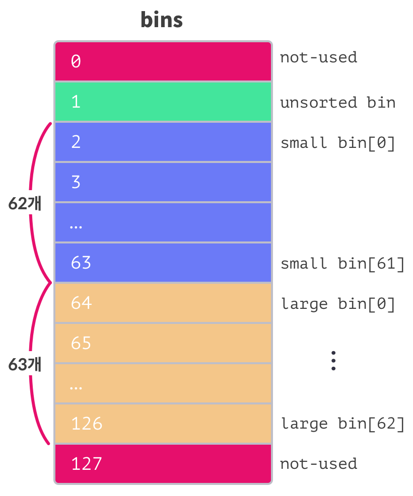 이 중 62개는 smallbin, 63개는 largebin, 1개는 unsortedbin으로 사용, 나머지 2개는 사용 X