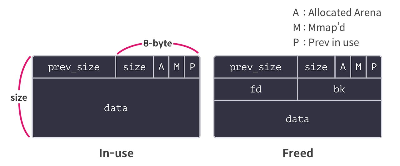| flags | 3비트 | allocated arena(A), mmap’d(M), prev-in-use(P) - prev-in-use: 직전 청크가 사용 중인지 -> 이를 참조해 병합이 필요한지 판단 |