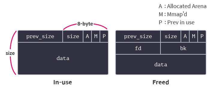 할당된 청크에서 데이터를 저장하는 부분 = 해제된 청크에서 fd와 bk 값 있는 부분