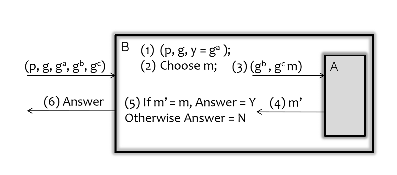 Elgamal 오라클은 g^b, (g^c * m)을 입력으로 받아 결과값을 출력하는데, 이 결과값을 m'이라 하자.