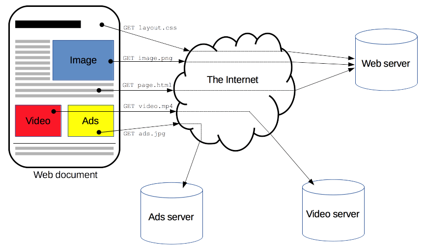 어떤 웹페이지의 텍스트, 이미지, 비디오 등은 따로따로 fetch되고, 이들이 재구성되어 완전한 문서, 즉 웹페이지를 이룹니다.