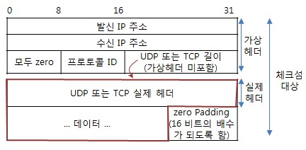 모든 field (그림 상에서 - 발신 IP 주소, 수신 IP 주소, 모두 zero, 프로토콜 ID, UDP 길이, UDP 실제 헤더(내의 발신 포트 번호, 수신 포트 번호, 길이), 데이터, zero padding)의 값을 word(= 4개의 4 bit) 단위로 모두 더합니다.