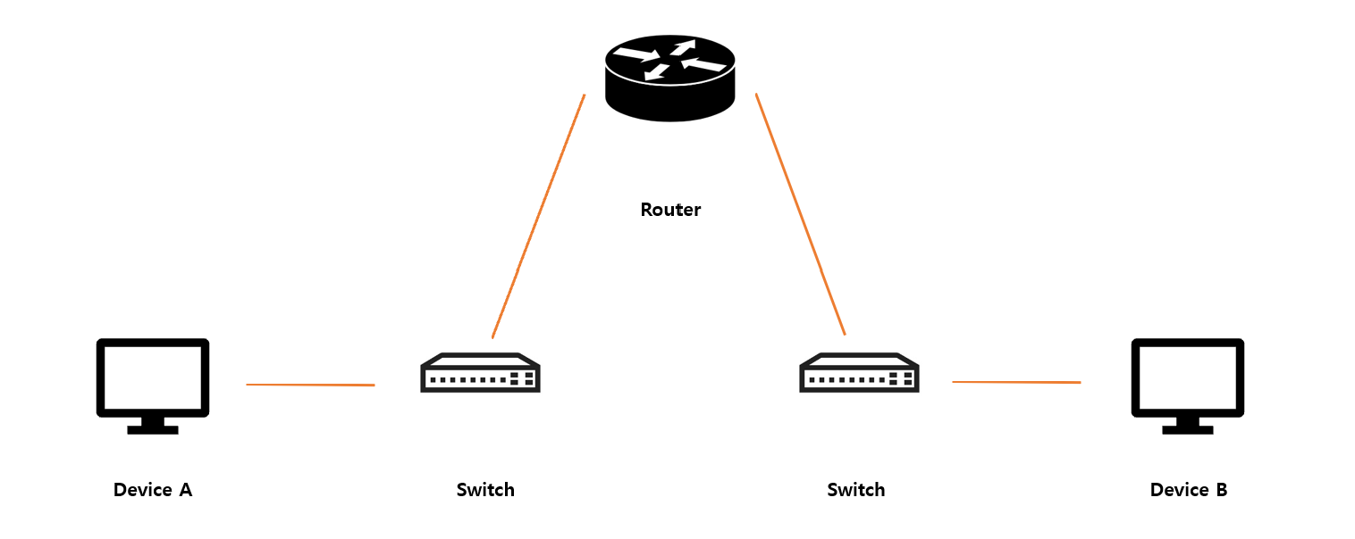 4) Router → B가 포함된 네트워크 (by broadcast): 위 ARP 요청 패킷 전달