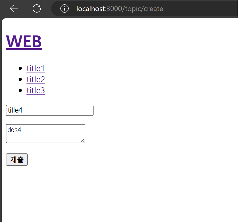 response.redirect(`/topic/${title}`); //// 생성한 페이지로 리다이렉트: 이게 없으면 response가 끝나지 않아 error 발생