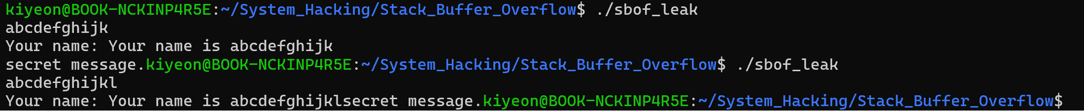 12바이트 이상이 되고부터는 name을 넘어 secret 값까지 출력되어버린다.