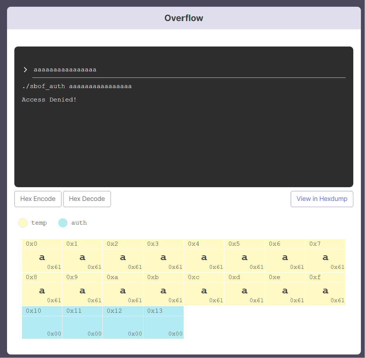 아래처럼, 입력값이 아직 16바이트라 auth 영역을 침범하고 오염시키지 않으면, 정상적으로 Access가 거부된다.