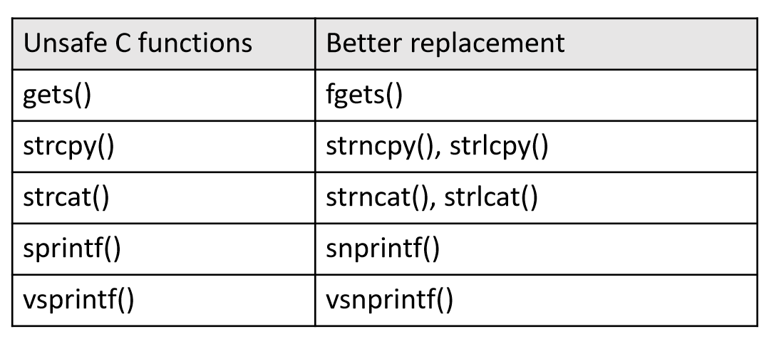 이외에도, C 코드에서 취약점을 유발하는 함수들을 아래와 같이 대체하여 보완할 수 있다.