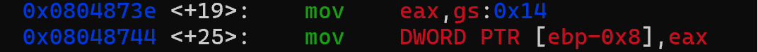 canary의 위치는 ebp-0x8 (canary의 크기는 4바이트 뿐인데 비해 ebp와의 거리는 8바이트나 되므로, 4바이트의 dummy가 껴있음을 추론 가능),