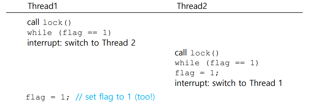 flag를 1로 설정하기도 전에 timer interrupt가 발생하여 thread2로 switch되고 thread2에서도 lock()을 호출)