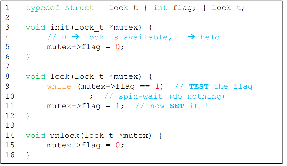 이러한 문제는, 현재의 flag값을 TEST한 뒤 그에 따라 필요시 flag를 SET하는 전 과정이 atomic하지 않기 때문이다.