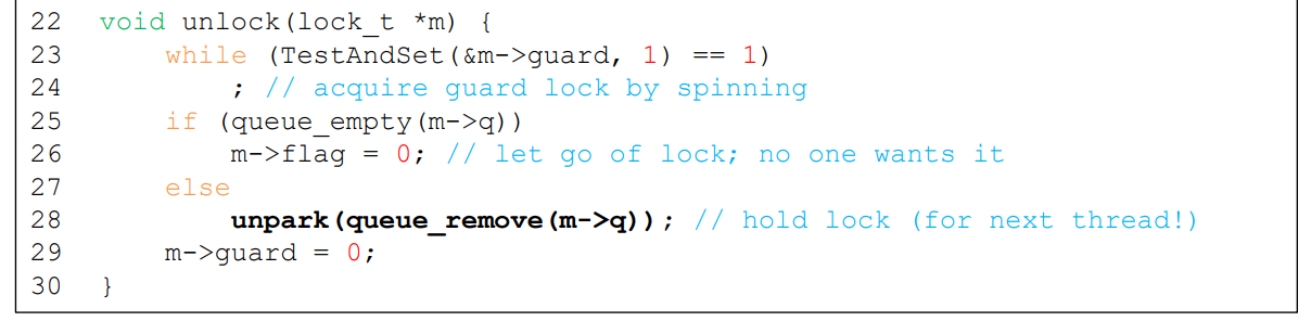 ※ q: lock을 얻으려 했으나 이미 다른 thread가 차지하고 있어서 못 얻은 thread들이, lock이 free되면 그것을 차지하기 위해, 온 순서대로 대기하는 queue