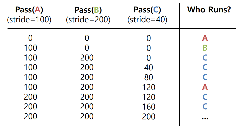프로세스가 run할 때, 이 프로세스의 stride씩 pass값에 더한다.