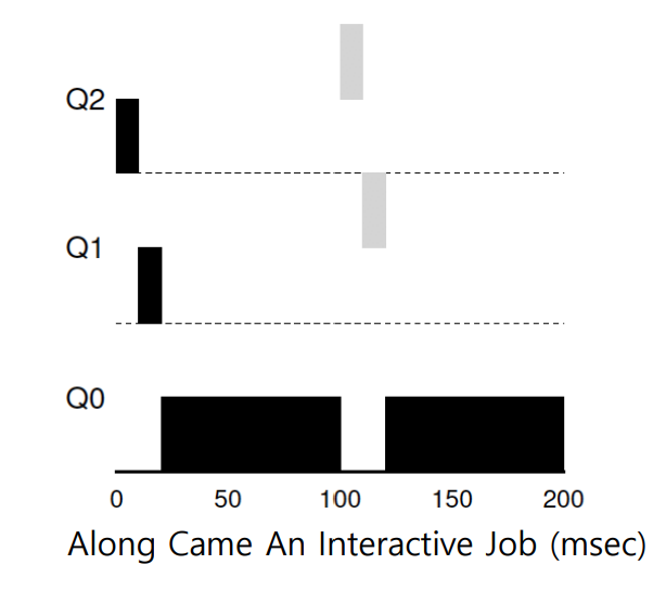 ▶Rule 4: Once a job uses up its time allotment at a given level (regardless of how many times it has given up the CPU), its priority is reduced(i.e., it moves down on queue).