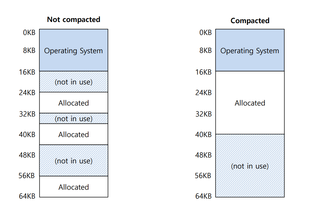 eg) free space가 총합 24kB라 해도, 매우 분산되어 있으면, 20kB의 segment를 allocate는 불가능...