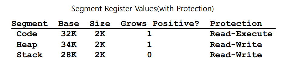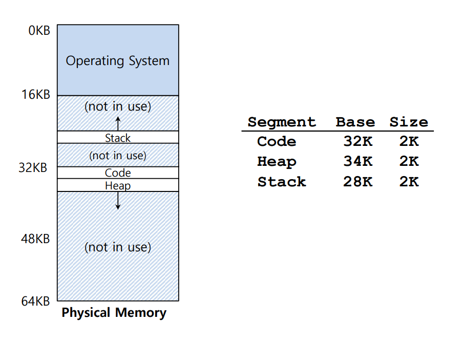 각 segment는 physical memory 상의 각기 다른 위치에 있으며, 각 semgent마다 base & bounds를 가진다.