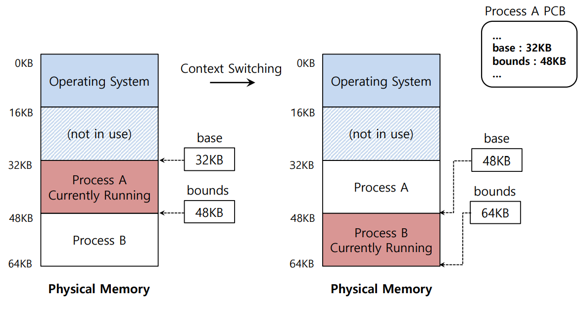 기존 프로세스의 base & bounds를 해당 프로세스의 PCB에 저장하고,