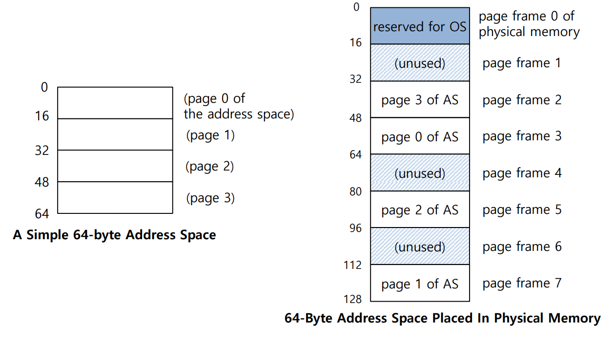 address space: 전체 크기 64바이트, page 16바이트