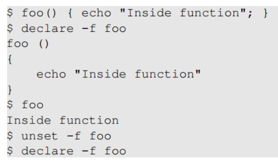 (정말 함수로서 인식하는지 보려고 다시 declare -f로 확인해 보았을때 여기서는 정상적으로 함수 코드가 보이며,