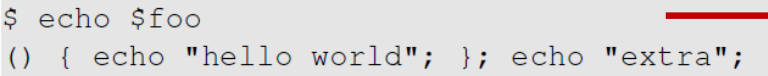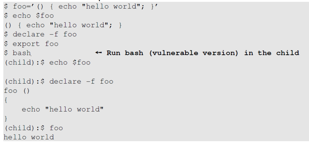 bash는 environment variable인 foo (아래)의 맨 앞 () { 를 보고 함수임을 인지한다.